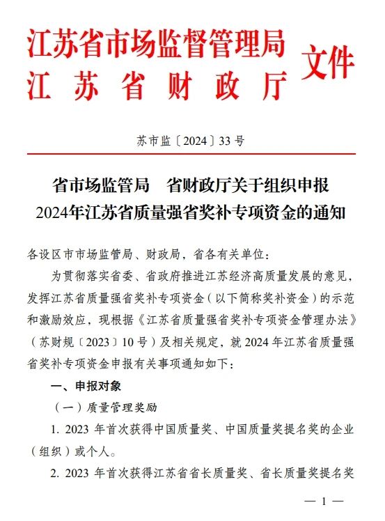 江蘇省市場監管局、江蘇省財政廳發布關于組織申報2024年江蘇省質量強省獎補專項資金的通知,申報對象包括2023年首次通過能源管理體系認證或節能產品認證或低碳產品認證或綠色產品認證,且經省市場監管局考核評估為優秀的企業。詳情如下: