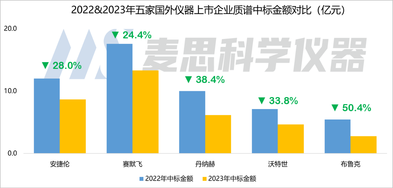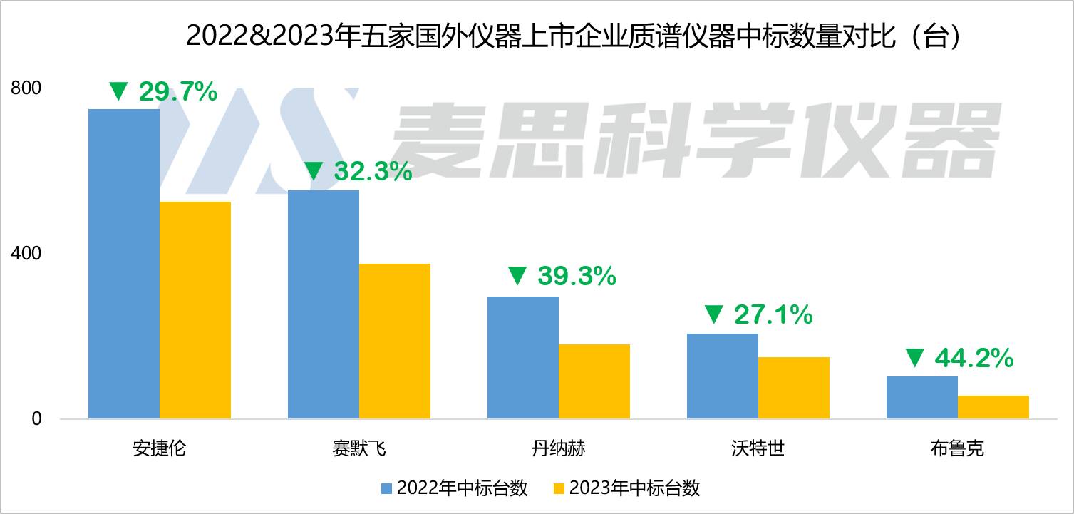 從中標(biāo)數(shù)據(jù)來(lái)看,雖然2023年上述五家國(guó)外企業(yè)進(jìn)入了中國(guó)質(zhì)譜儀器中標(biāo)市場(chǎng)的TOP 10廠商行列,但他們中標(biāo)數(shù)量和中標(biāo)金額同比都有比較明顯的下降。