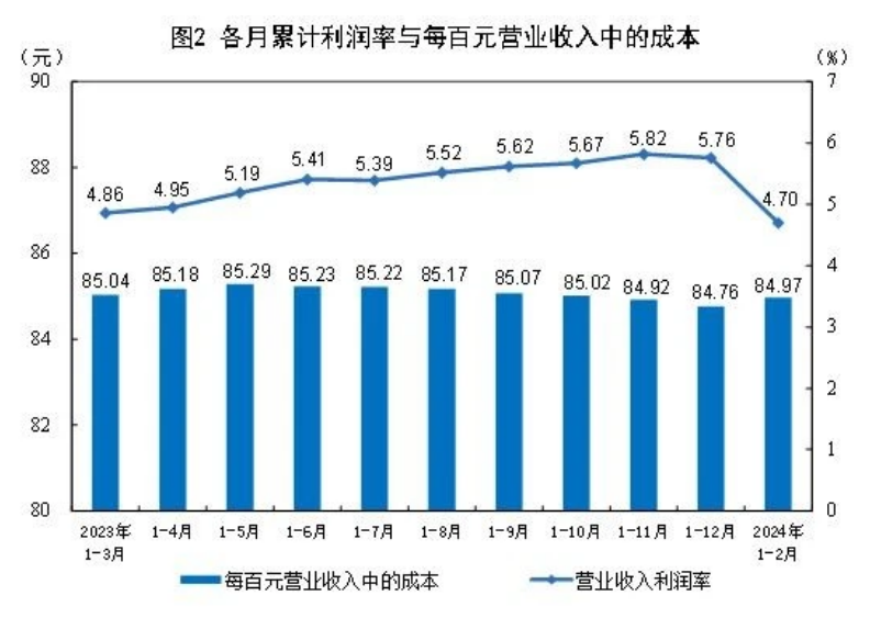 1—2月份,規(guī)模以上工業(yè)企業(yè)每百元營業(yè)收入中的成本為84.97元,同比增加0.11元;每百元營業(yè)收入中的費用為8.62元,同比減少0.01元。