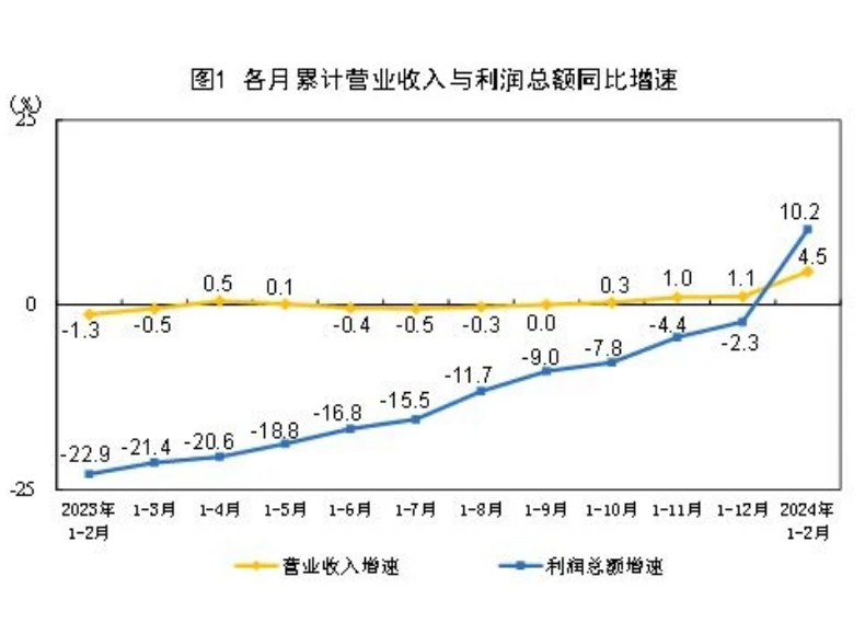 1—2月份,規(guī)模以上工業(yè)企業(yè)實現(xiàn)營業(yè)收入19.44萬億元,同比增長4.5%;發(fā)生營業(yè)成本16.52萬億元,增長4.6%;營業(yè)收入利潤率為4.70%,同比提高0.24個百分點。