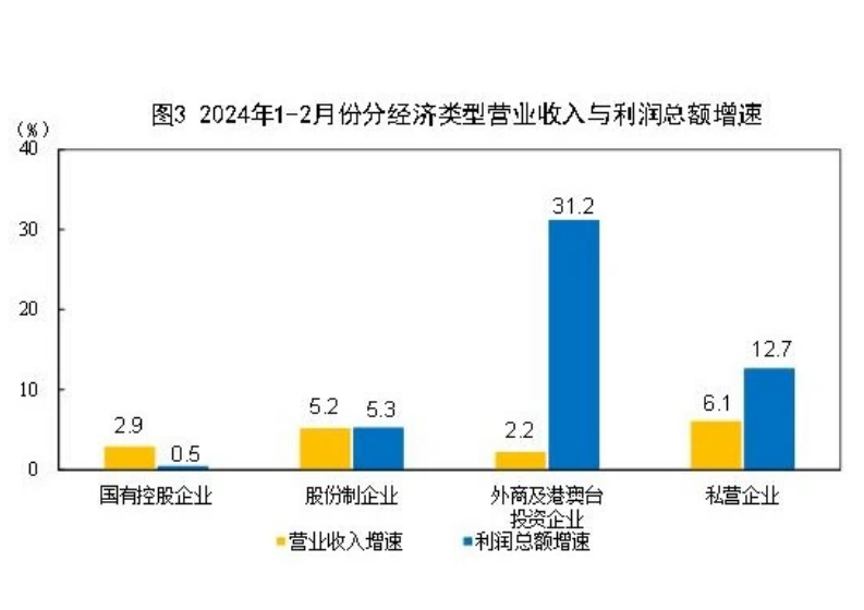 1—2月份,規(guī)模以上工業(yè)企業(yè)中,國有控股企業(yè)實現(xiàn)利潤總額3434.9億元,同比增長0.5%;股份制企業(yè)實現(xiàn)利潤總額6898.5億元,增長5.3%;外商及港澳臺投資企業(yè)實現(xiàn)利潤總額2169.2億元,增長31.2%;私營企業(yè)實現(xiàn)利潤總額2465.4億元,增長12.7%。