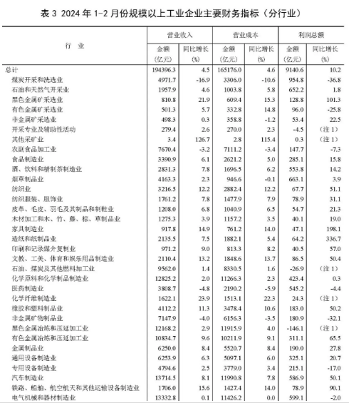 1—2月份,主要行業(yè)利潤情況如下:計算機、通信和其他電子設備制造業(yè)利潤增長2.1倍,電力、熱力生產和供應業(yè)增長69.4%,有色金屬冶煉和壓延加工業(yè)增長65.5%,紡織業(yè)增長51.1%,汽車制造業(yè)增長50.1%,通用設備制造業(yè)增長20.7%,石油和天然氣開采業(yè)增長1.8%,化學原料和化學制品制造業(yè)增長0.3%,煤炭開采和洗選業(yè)下降36.8%,非金屬礦物制品業(yè)下降32.1%,專用設備制造業(yè)下降17.0%,農副食品加工業(yè)下降7.3%,電氣機械和器材制造業(yè)下降2.0%,石油煤炭及其他燃料加工業(yè)和黑色金屬冶煉和壓延加工業(yè)虧損均增加。