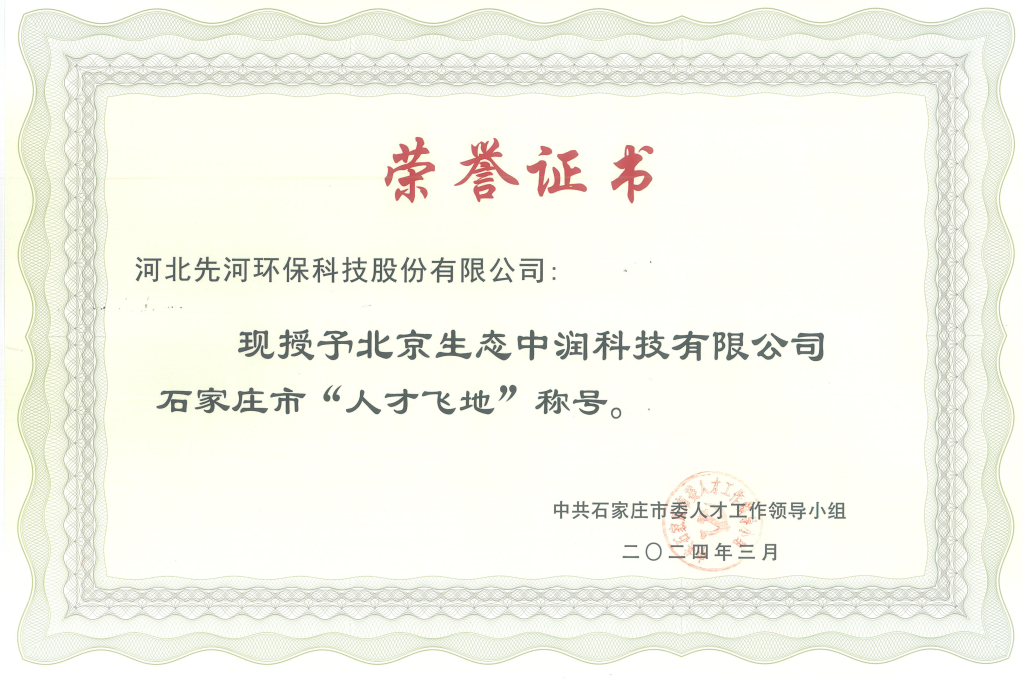 近日,中共石家莊市委人才工作領導小組對2024年度石家莊市“人才飛地”認定結果進行通報,北京生態中潤科技有限公司作為先河環保北京研發中心載體,正式被認定為石家莊市“人才飛地”稱號。