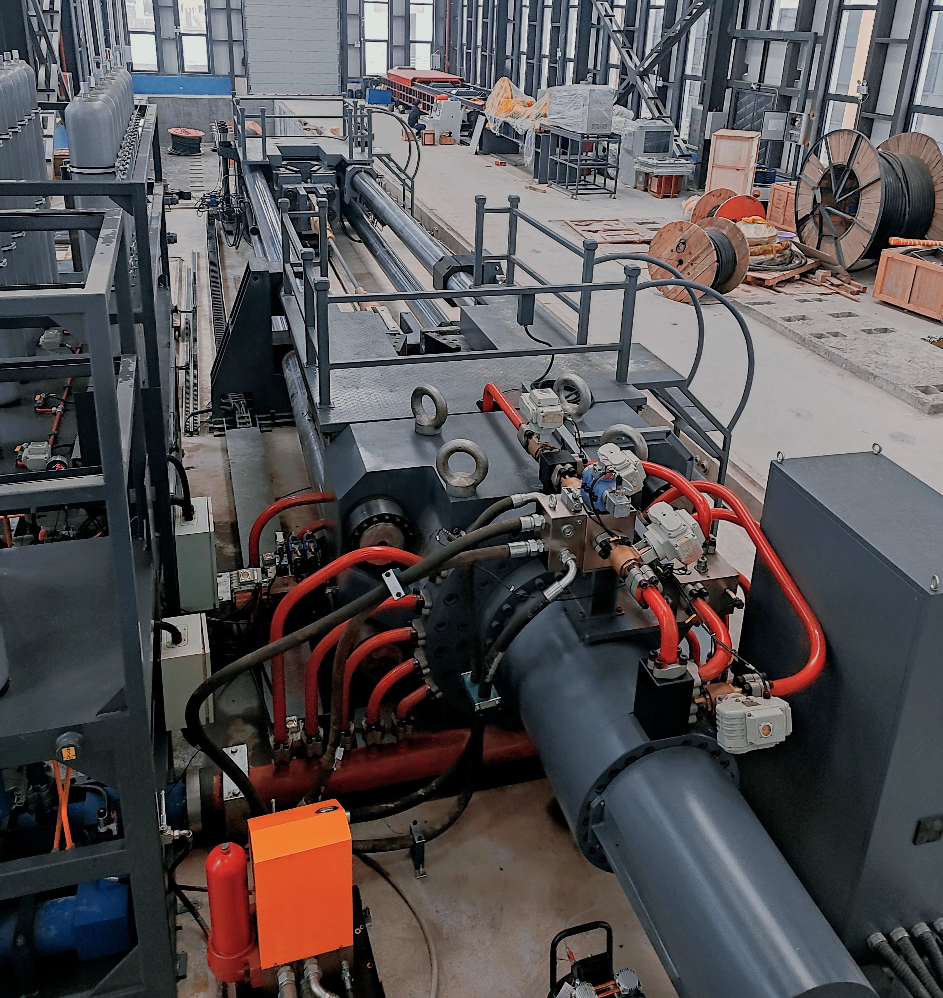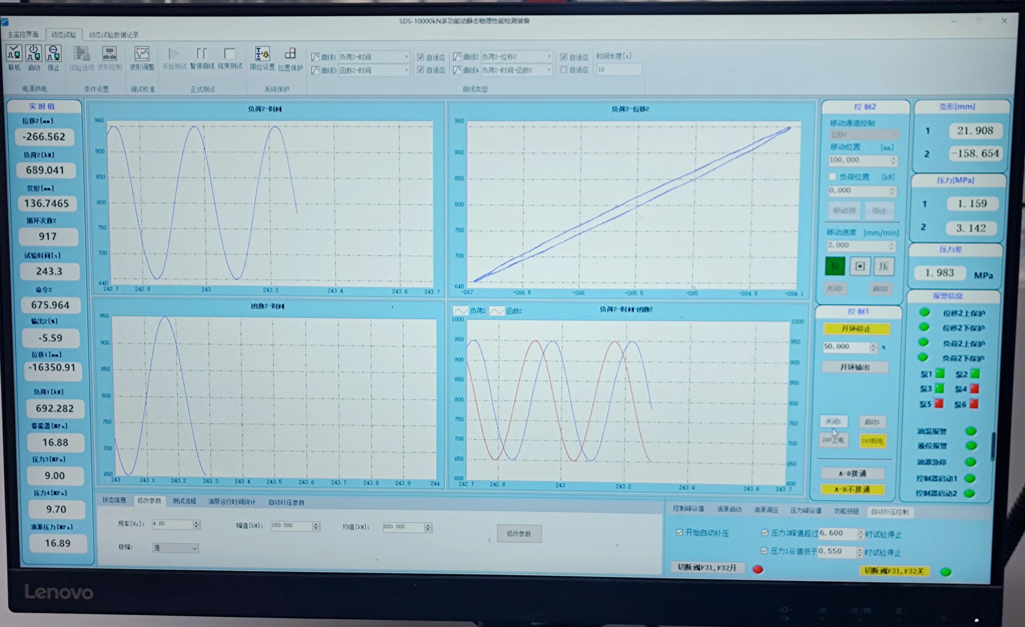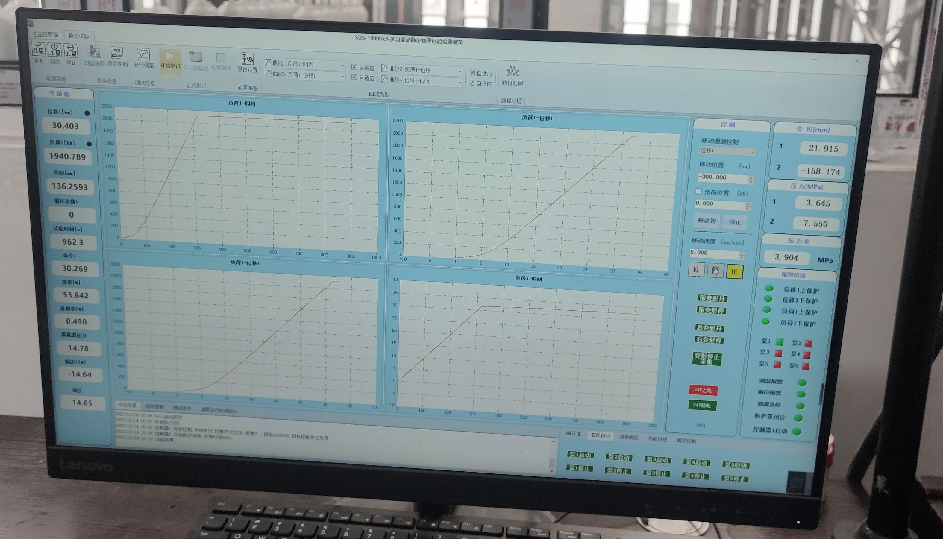 設(shè)備具有750噸的動(dòng)態(tài)疲勞試驗(yàn)、1000噸的靜態(tài)試驗(yàn)、1000噸的蠕變?cè)囼?yàn)等功能,試樣的長(zhǎng)度可達(dá)8m,鋼絲繩試樣可安裝最大直徑160mm,錨具試樣最大可作到55孔,焊接球試樣最大直徑351mm,螺紋鋼試樣最大直徑75mm,且可進(jìn)行進(jìn)行直徑75mm螺紋鋼的脆斷試驗(yàn)。主缸最大行程600mm,進(jìn)行頻率為3Hz的750t的動(dòng)態(tài)疲勞試驗(yàn)時(shí),最大試驗(yàn)位移可達(dá)8mm。可擴(kuò)展多種夾具,適應(yīng)不同試驗(yàn)方法,可進(jìn)行鋼絲繩、建筑用索、公路懸索吊索、橋梁斜拉索、螺紋鋼、焊接球等大型結(jié)構(gòu)件的多種類型試驗(yàn),實(shí)現(xiàn)一機(jī)多用,設(shè)備在研制過(guò)程中為攻克了電液伺服與比例伺服相復(fù)合的關(guān)系,國(guó)內(nèi)首創(chuàng)復(fù)合動(dòng)態(tài)加載技術(shù)、雙聯(lián)耦合加載節(jié)能技術(shù)、雙缸雙控加載控制技術(shù)及大噸位同軸等關(guān)鍵技術(shù),實(shí)現(xiàn)產(chǎn)品多模式、多試驗(yàn)類型工況,加載效率提升3倍以上;自主研發(fā)了兩位球閥防卡死裝置、高能量緩沖裝置等安全系統(tǒng)、保障設(shè)備穩(wěn)定運(yùn)行;研發(fā)了大跨度斜拉索平行鋼絲拉索抗彎疲勞裝置,實(shí)現(xiàn)大噸位工況模擬測(cè)試。