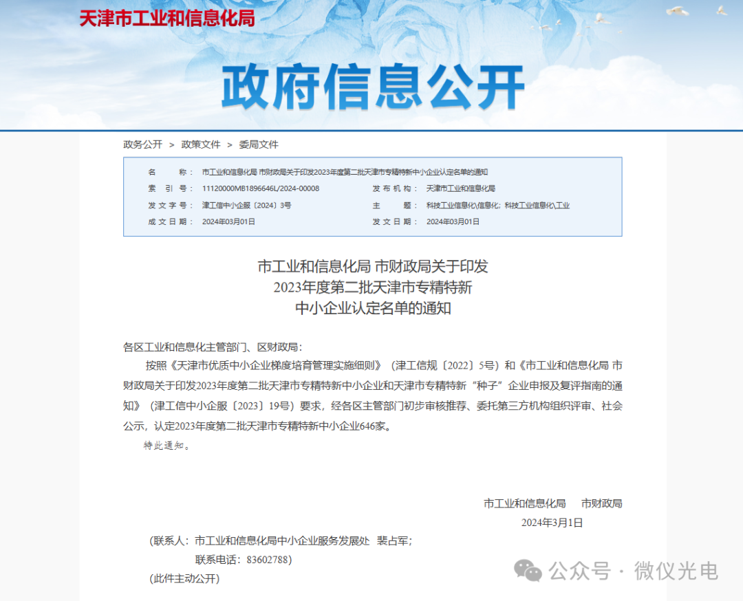 2024年3月1日,天津市工業和信息化局官方網站發布了《市工業和信息化局 市財政局關于印發2023年度第二批天津市專精特新中小企業和天津市專精特新“種子”企業申報及復評指南的通知》,微儀光電(天津)有限公司(以下簡稱“微儀光電”)榜上有名,獲評“專精特新”中小企業稱號!這是一項非常重要的榮譽,也是我公司多年專注技術創新和不斷提升核心競爭力的成果。