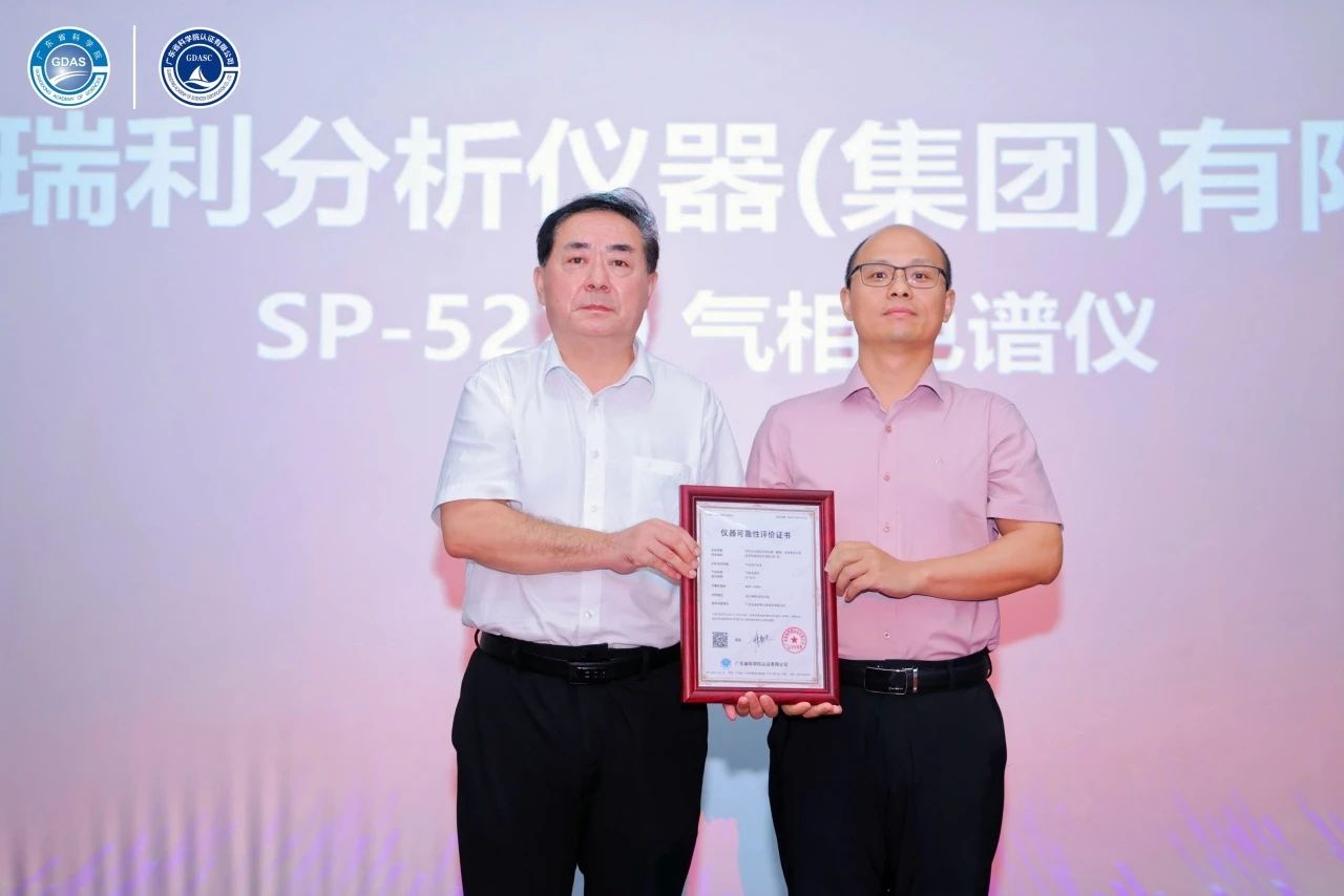 活動現場,廣東省科學院黨委書記廖兵為獲得首批產品認證、鑒定評價證書的9家企業頒發證書,為企業完善產品和提升市場競爭力賦能。北京北分瑞利分析儀器(集團)有限責任公司SP-5220氣相色譜儀產品獲得此項殊榮,公司副總經理周加才參加本次活動并上臺領獎。