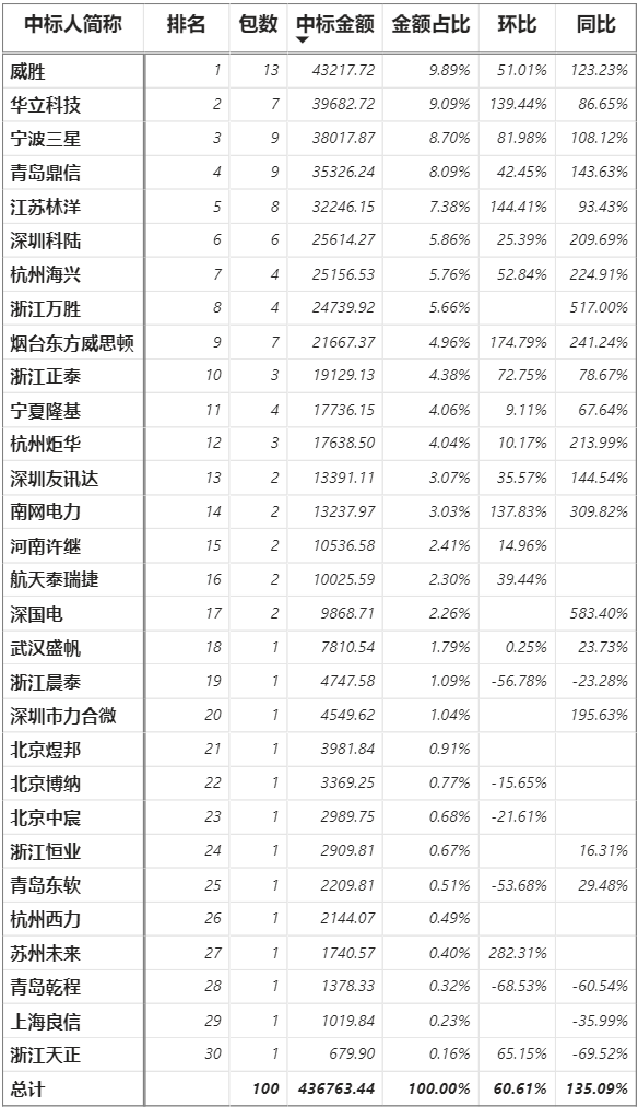 總金額43.68億元,30家企業(yè)實(shí)現(xiàn)中標(biāo)(威勝集團(tuán)+威勝信息計(jì)為1家,正泰電器+正泰儀表計(jì)為1家),威勝以4.32億元位列各企業(yè)第一名,華立中標(biāo)3.97億元第二,三星3.80億元第三,鼎信3.53億元第四。