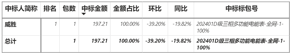 總金額197.21萬(wàn)元,1家企業(yè)實(shí)現(xiàn)中標(biāo),威勝中標(biāo)197.21萬(wàn)元;