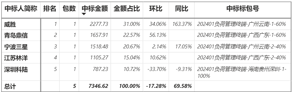 總金額7346.62萬(wàn)元,5家企業(yè)實(shí)現(xiàn)中標(biāo),威勝中標(biāo)最大包2277.73萬(wàn)元;