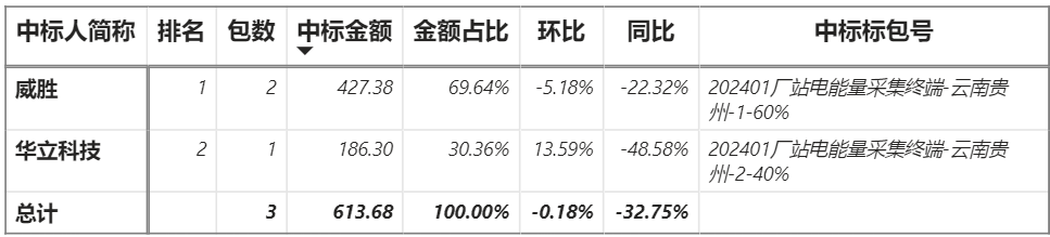 總金額613.68萬(wàn)元,2家企業(yè)實(shí)現(xiàn)中標(biāo),威勝中標(biāo)2包共427.38萬(wàn)元;