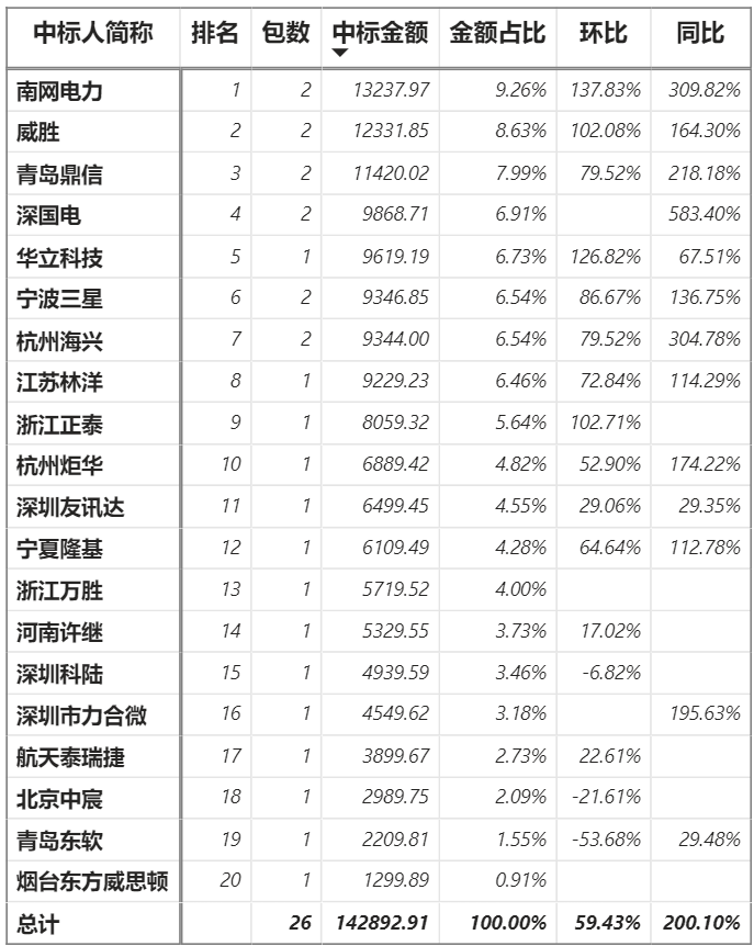 總金額14.29億元,20家企業(yè)實(shí)現(xiàn)中標(biāo);南網(wǎng)科技、威勝、鼎信、深國(guó)電、三星、海興中標(biāo)2包;