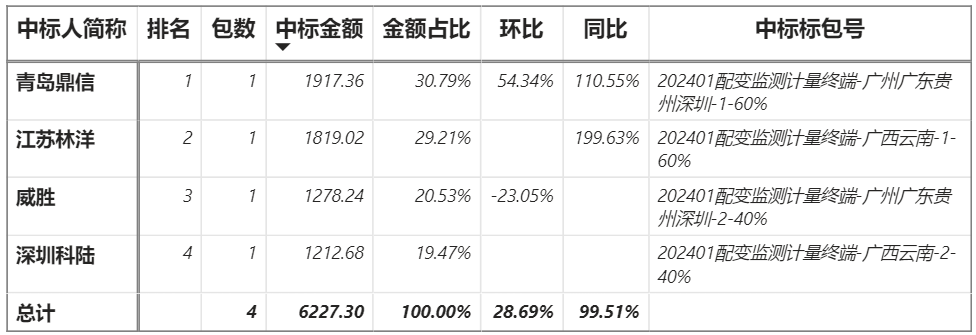總金額6227.30萬(wàn)元,4家企業(yè)實(shí)現(xiàn)中標(biāo),鼎信中標(biāo)最大包1917.36萬(wàn)元;