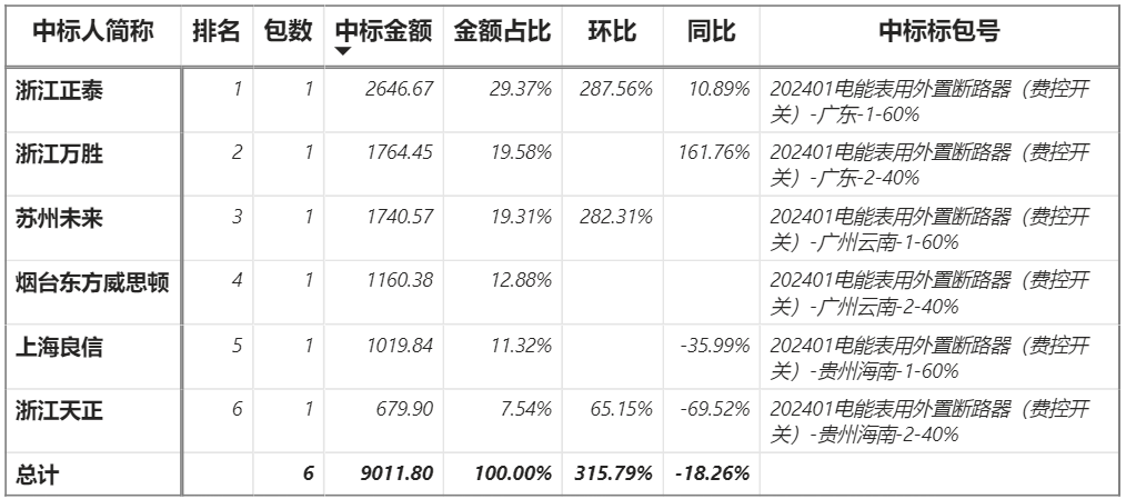 總金額9011.80萬(wàn)元,6家企業(yè)實(shí)現(xiàn)中標(biāo),正泰中標(biāo)最大標(biāo)包2646.67萬(wàn)元;