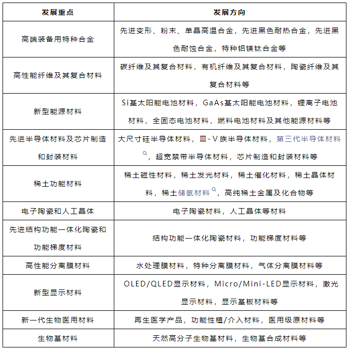 關(guān)鍵戰(zhàn)略材料領(lǐng)域發(fā)展重點(diǎn)及發(fā)展方向主要包括高端裝備用特種合金、高性能纖維及其復(fù)合材料、新型能源材料、先進(jìn)半導(dǎo)體材料及芯片制造和封裝 材料、稀土功能材料、電子陶瓷和人工晶體、先進(jìn)結(jié)構(gòu)功能一體化陶瓷和功能梯度材料、高性能分離膜材料、新型顯示材料、新一代生物醫(yī)用材料及生物基材料等(見(jiàn)表6)。