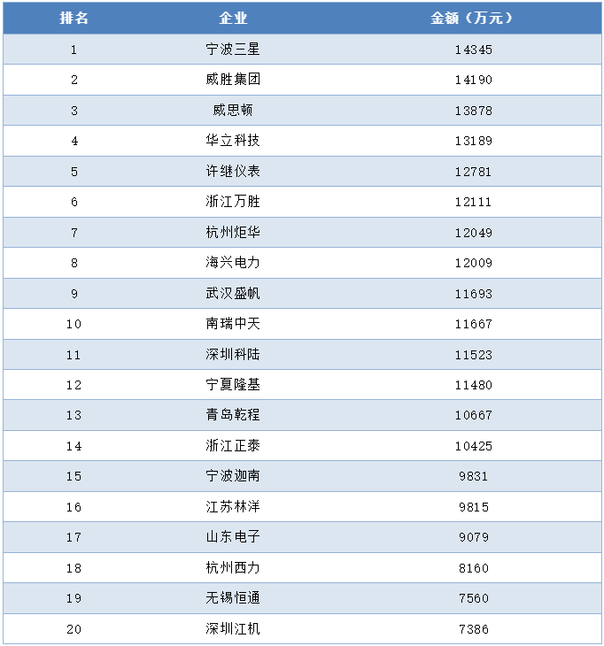 A級單相智能電能表中標金額前十企業