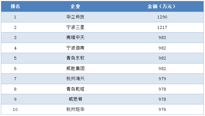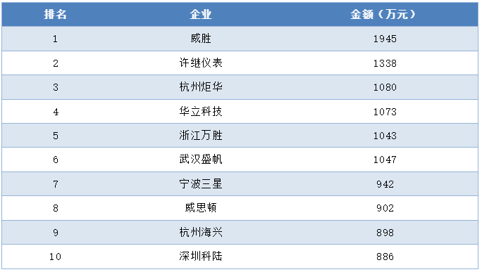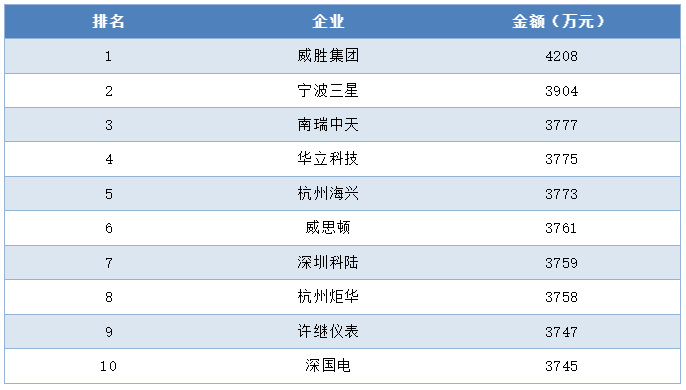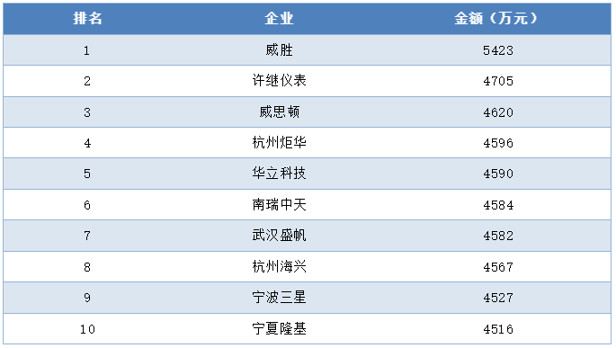 集中器及采集器中標金額前十企業