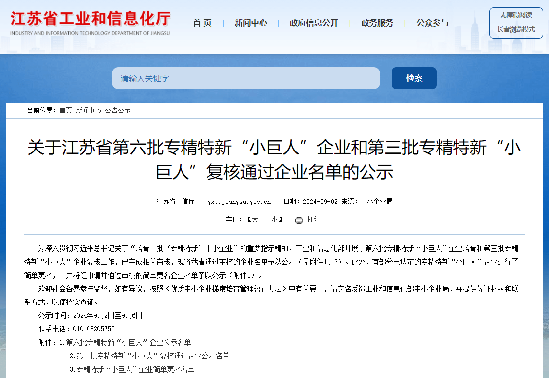 近日,江蘇省工業和信息化部公示了由國家工業和信息化部復核通過的第六批專精特新小巨人企業培育名單,其中蘇州貝茵科技股份有限公司成功上榜。