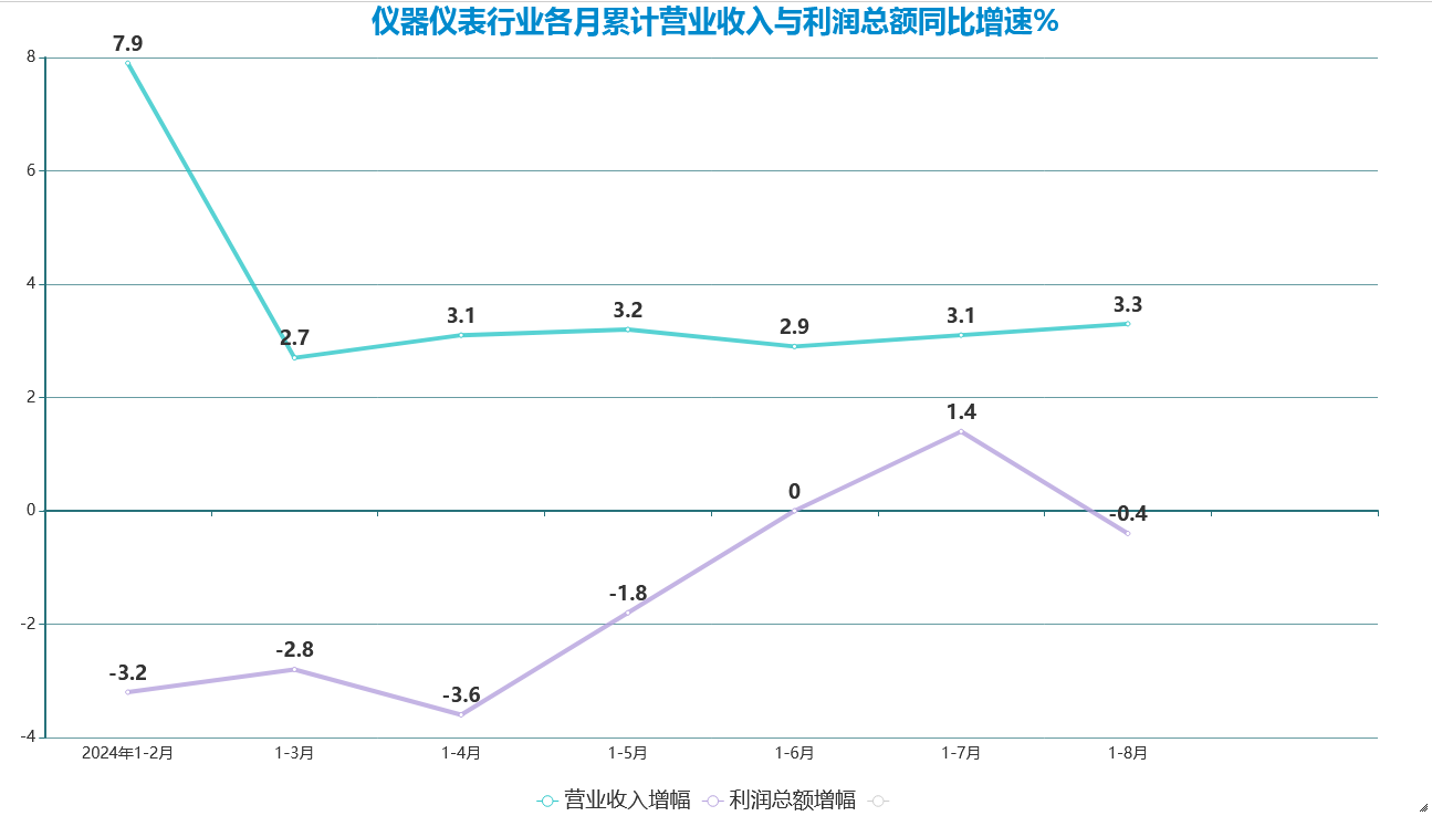 摘要:國家統計局發布最新數據,1—8月份,儀器儀表制造業營業收入6363.5億元,同比增長3.3%,實現利潤總額611.8億元,同比增長-0.4%(1-7月利潤總額同比增幅為1.4%)。