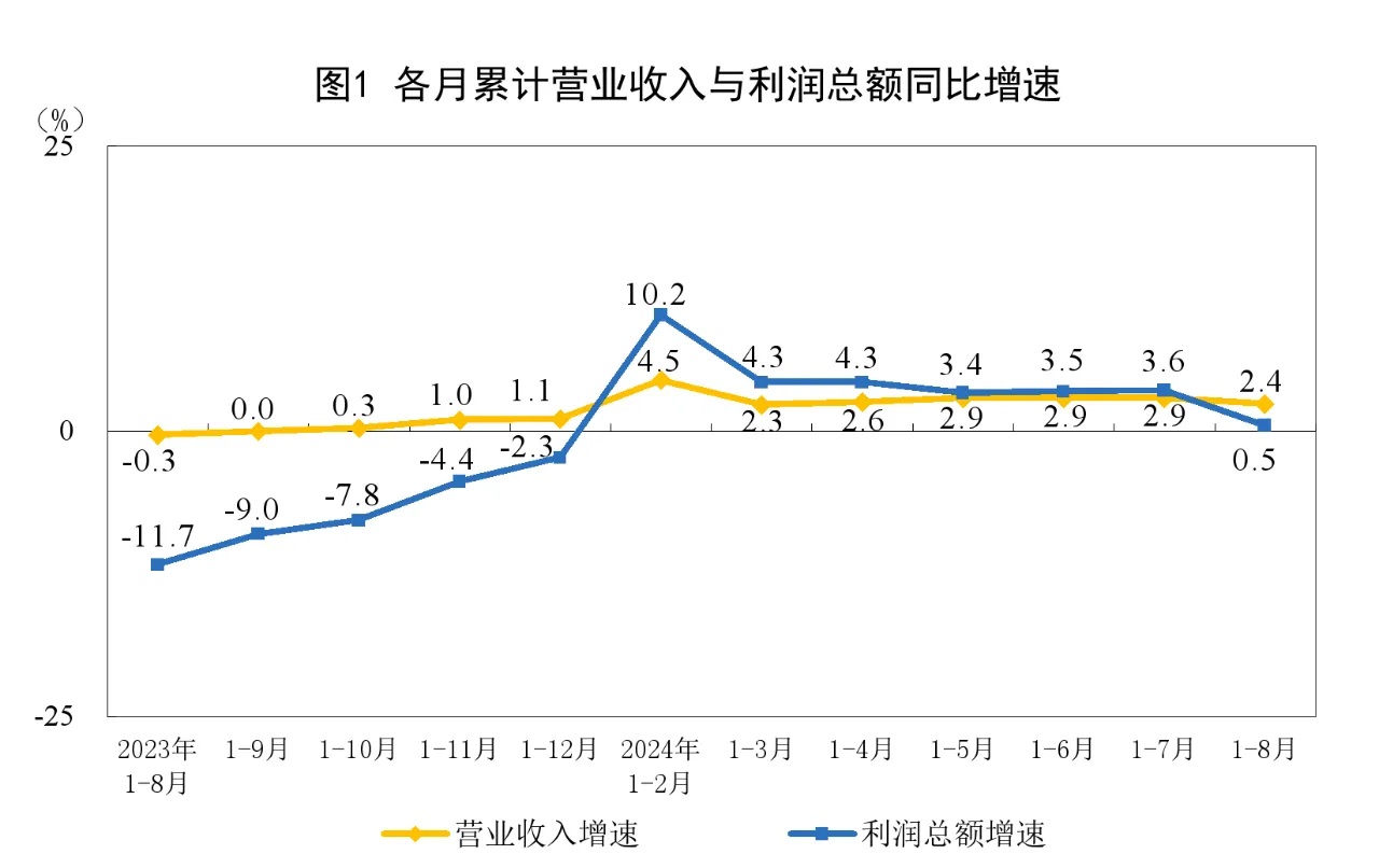 1—8月份,全國規模以上工業企業實現利潤總額46527.3億元,同比增長0.5%(按可比口徑計算,詳見附注二)。