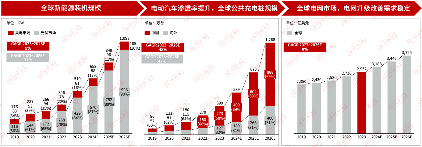 隨著光伏技術(shù)進(jìn)步和產(chǎn)業(yè)規(guī)?;苿?dòng),光伏成本持續(xù)降低,世界光伏新增裝機(jī)量復(fù)合增長率達(dá)到32%。隨著新能源汽車行業(yè)的發(fā)展,汽車行業(yè)迎來了較高的增長期,與之對應(yīng)的充電樁規(guī)模也隨之高速增長,全球公共充電樁市場規(guī)模以48%的復(fù)合增長率快速增長。全球電網(wǎng)投資穩(wěn)定增長,預(yù)計(jì)將以8%的復(fù)合增長率增長,電網(wǎng)升級改善需求穩(wěn)定。