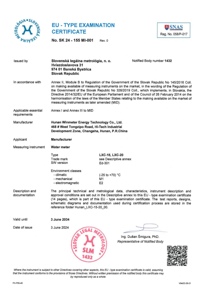 斯洛伐克法定計量(SLM)是全球公認的水計量型式認可機構。SLM是永久提供高品質和經濟實惠的計量服務,并頒發MIDOIML證書。這些證書被世界各地的公用事業公司廣泛要求,以確保供應的產品具備各種工況下的長期準確性。
