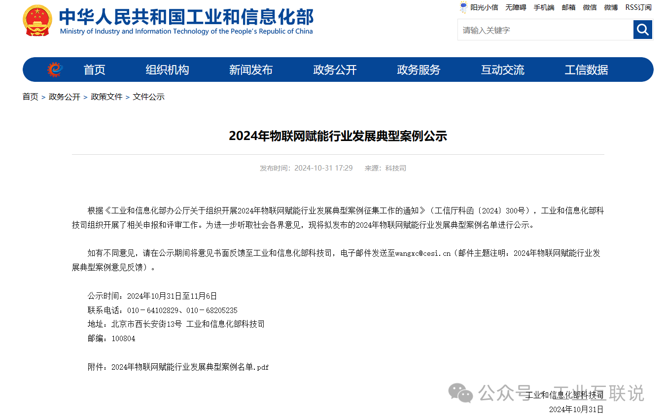 10月31日消息,工信部官方發(fā)布2024年物聯(lián)網(wǎng)賦能行業(yè)發(fā)展典型案例公示。