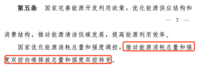 第五條:國家完善能源開發利用政策,優化能源供應結構和消費結構,推動能源清潔低碳發展,提高能源利用效率。國家優化能源消耗總量和強度調控,推動能源消耗總量和強度雙控向碳排放總量和強度雙控轉變。