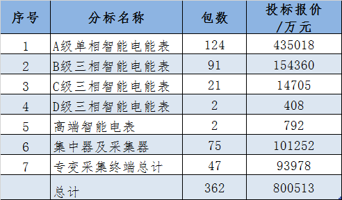 A級(jí)單相智能電能表招124包435018萬(wàn)元,占總金額的54.34%;