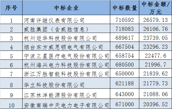 本次中標(biāo)金額前五名企業(yè)為河南許繼儀表有限公司、威勝集團(tuán)(含威勝信息)、杭州炬華科技股份有限公司、煙臺(tái)東方威思頓電氣有限公司、寧波三星醫(yī)療電氣股份有限公司。