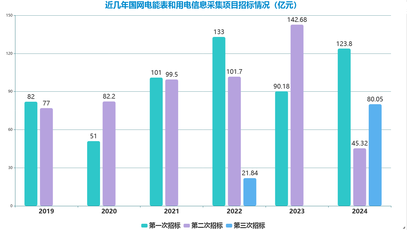 2024年國(guó)網(wǎng)3個(gè)批次電能表和用電信息采集項(xiàng)目公示中標(biāo)金額達(dá)到249.17億元,同比2023年增長(zhǎng)7%左右;3個(gè)批次招標(biāo)總量9198萬(wàn)只,同比增長(zhǎng)25%。其中:?jiǎn)蜗啾碚袠?biāo)7568萬(wàn)只,同比增長(zhǎng)31%;三相表招標(biāo)1366萬(wàn)只,同比增長(zhǎng)0.56%,其中高端智能電表招標(biāo)1.5萬(wàn)只;采集器等設(shè)備招標(biāo)265萬(wàn)只,同比增長(zhǎng)25%。