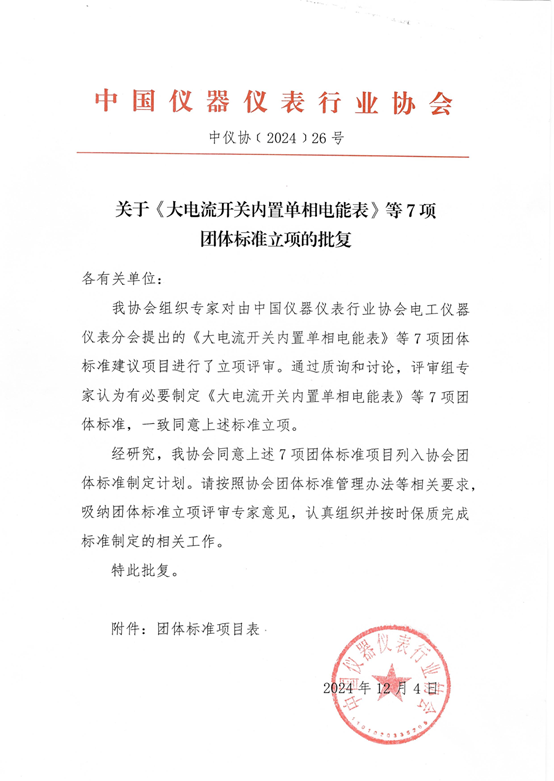 近日,根據《中國儀器儀表行業協會團體標準管理辦法》的規定,經審查,對由中國儀器儀表行業協會電工儀器儀表分會提出的《大電流開關內置單相電能表》等7項團體標準進行立項(標準編號和名稱見下表),特此公告。