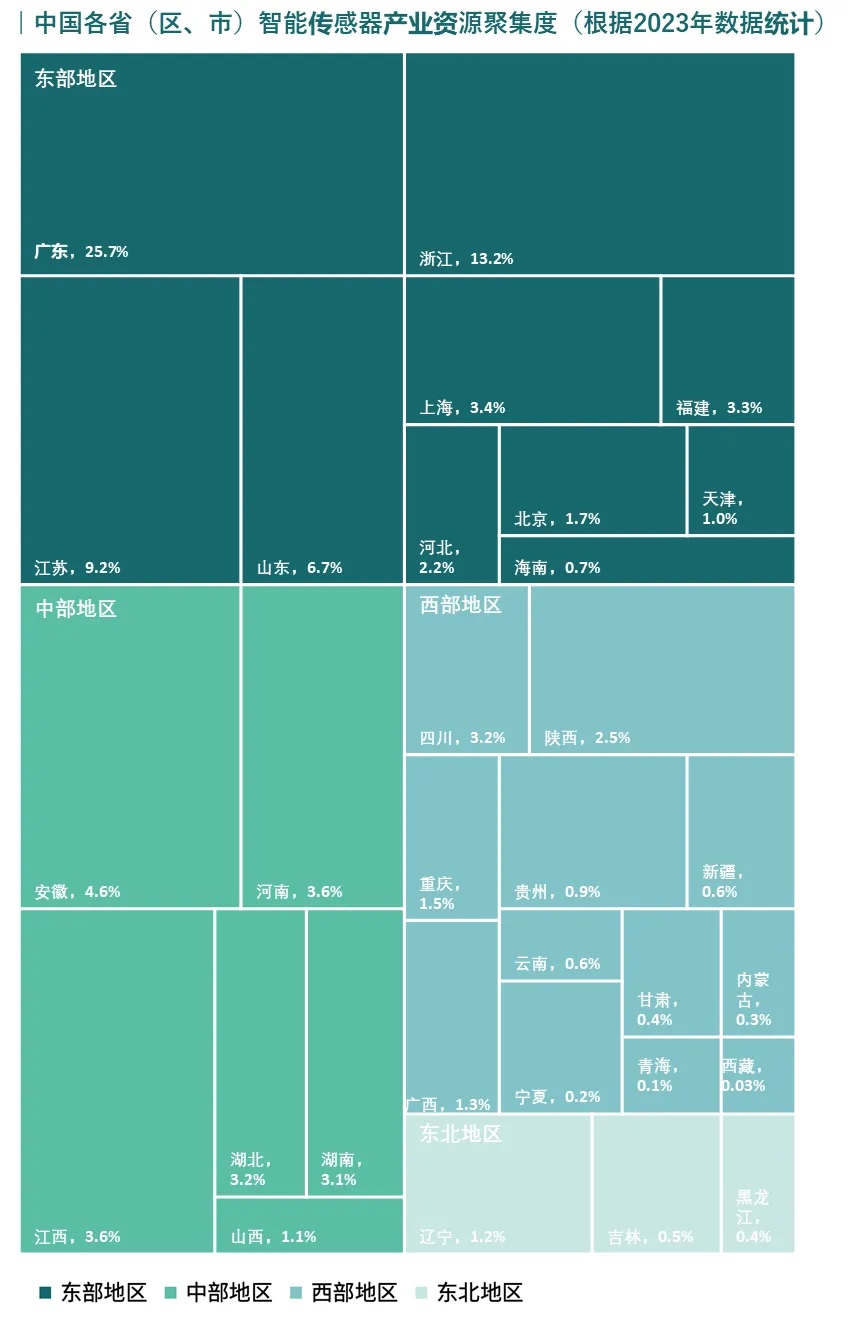 中國(guó)智能傳感器區(qū)域發(fā)展整體呈現(xiàn)東部持續(xù)領(lǐng)先、中西部崛起有望的態(tài)勢(shì)。目前,東部地區(qū)聚集了全國(guó)67.1%的產(chǎn)業(yè)資源,廣東、浙江、江蘇、山東、上海等省(市)的企業(yè)資源領(lǐng)跑全國(guó)。近年來,中部的安徽、河南、湖北等地以及西部的四川、陜西、重慶等地,也在持續(xù)加大對(duì)智能傳感器產(chǎn)業(yè)的支持力度。“十五五”時(shí)期,中國(guó)的智能傳感器產(chǎn)業(yè)資源將仍以東部為引領(lǐng),但中西部的部分省份也將逐步崛起,實(shí)現(xiàn)區(qū)域多點(diǎn)開花的發(fā)展格局。
