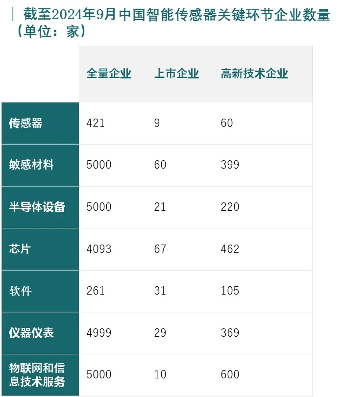 截至2024年9月,中國(guó)智能傳感器全產(chǎn)業(yè)鏈企業(yè)數(shù)量達(dá)到2.0萬(wàn)家,其中,上市企業(yè)227家、高新技術(shù)企業(yè)2215家。“十五五”時(shí)期,隨著物聯(lián)網(wǎng)、人工智能、智能制造等領(lǐng)域的快速發(fā)展,中國(guó)智能傳感器在智能家居、可穿戴設(shè)備、智能移動(dòng)終端等新興領(lǐng)域的應(yīng)用將不斷增加。