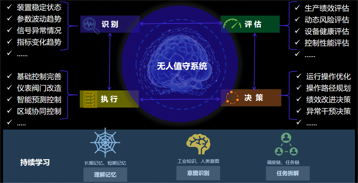 “無人”值守能夠?qū)⑵髽I(yè)較為稀缺的人力資源從復(fù)雜、繁瑣、重復(fù)的操作活動中解放出來,提升裝置運行水平、安全水平和效益,減少非計劃停工,對裝置的長周期、高效自主運行具有深遠意義,是化工裝置“安、穩(wěn)、長、滿、優(yōu)”高度自主運行的集中體現(xiàn)。區(qū)別于傳統(tǒng)的“黑屏操作”,“無人”值守的關(guān)鍵在于裝置系統(tǒng)能夠具備“識別-評估-決策-執(zhí)行”的自主能力,實現(xiàn)對外部的需求或干擾進行自主響應(yīng),同時又可對系統(tǒng)內(nèi)部要素的完整性、健康性、穩(wěn)定性進行自我管理,最終達到無需人工干預(yù)、實現(xiàn)無人值守的目標。
