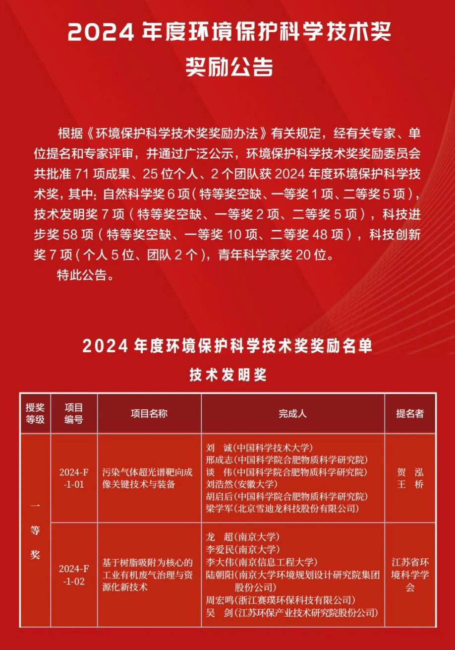 1月10日,生態環境部發布2024年度環境保護科學技術獎獎勵公告。中國科學技術大學、中國科學院合肥物質科學研究院、安徽大學、北京雪迪龍科技股份有限公司共同完成的科研成果“污染氣體超光譜靶向成像關鍵技術與裝備”,由賀泓、王橋兩位中國工程院院士提名,榮獲2024年度“環境保護科學技術獎”技術發明獎一等獎。