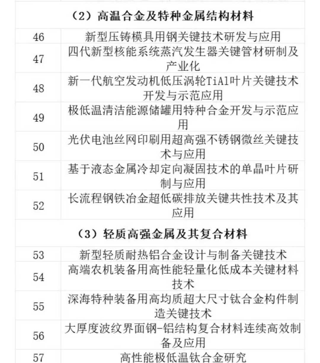 根據工信部國家重點研發計劃2024年度項目申報指南,共涵蓋“高端功能與智能材料、先進結構與復合材料、新型顯示與戰略性電子材料、高性能制造技術與重大裝備、微納電子技術、新能源汽車”等在內16個重點專項。其中,“先進結構與復合材料”專項涉及7項高溫合金及特種金屬結構材料和5項輕質高強金屬及其復合材料。具體如下:
