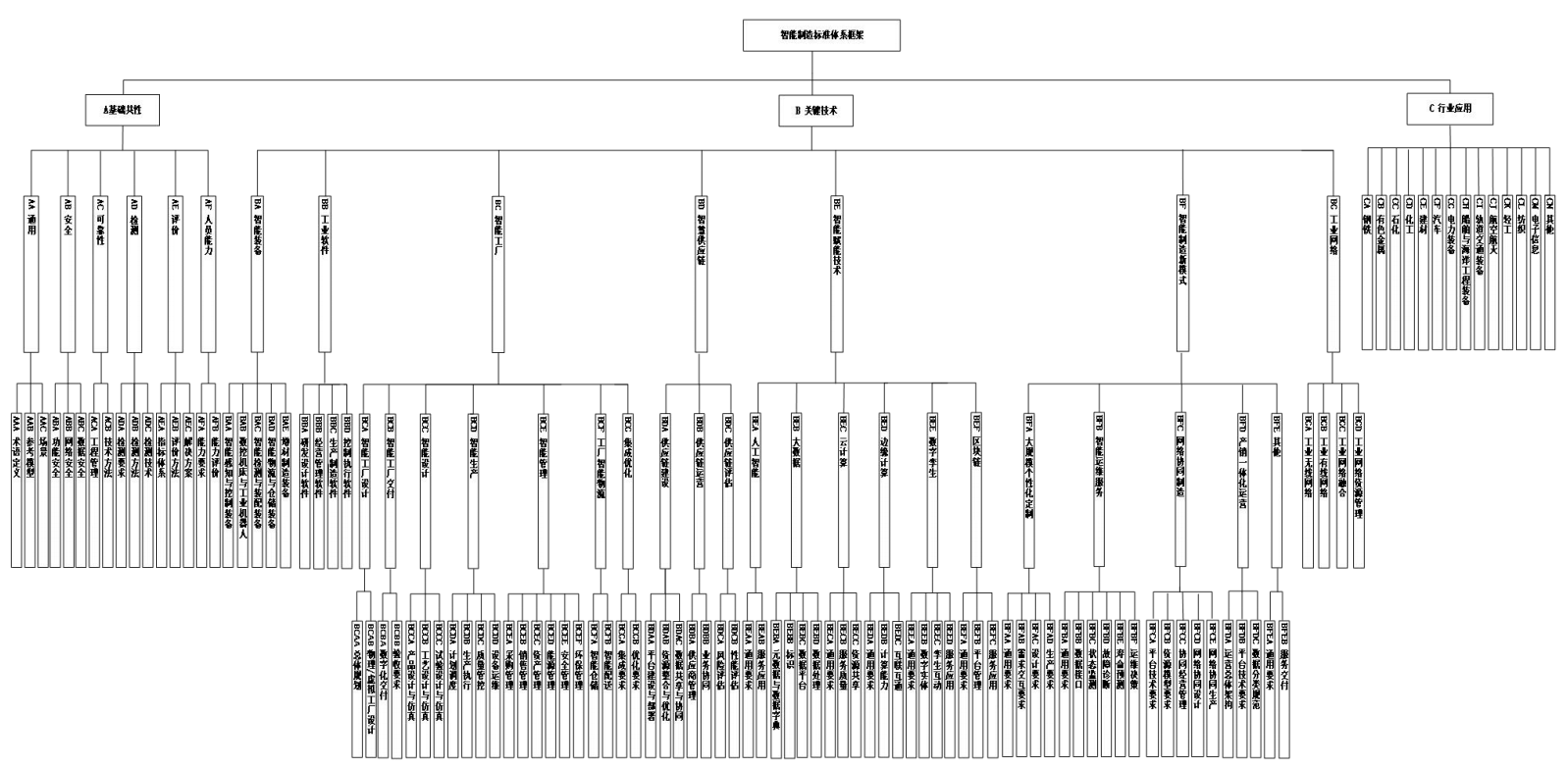 智能制造標(biāo)準(zhǔn)體系結(jié)構(gòu)包括A基礎(chǔ)共性、B關(guān)鍵技術(shù)、C行業(yè)應(yīng)用等3個(gè)部分,主要反映標(biāo)準(zhǔn)體系各部分的組成關(guān)系。智能制造標(biāo)準(zhǔn)體系結(jié)構(gòu)圖如圖2所示。