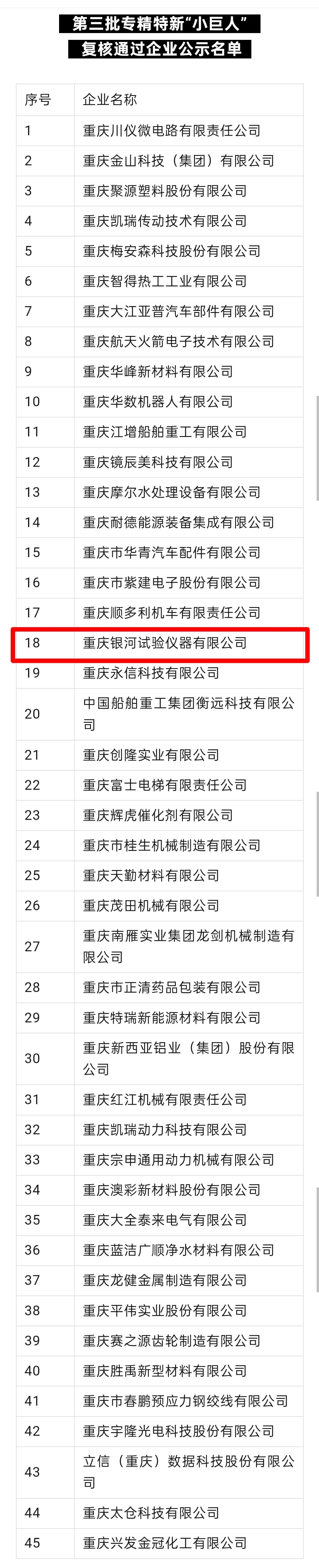 202492,重慶市經濟和信息化委員會公示了通過審核的企業名單,重慶銀河試驗儀器有限公司在第三批專精特新小巨人復核通過企業公示名單中。