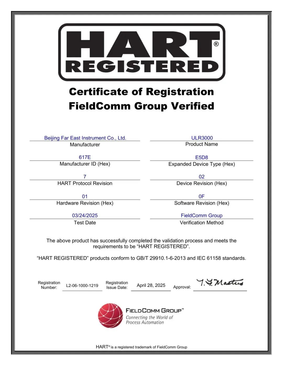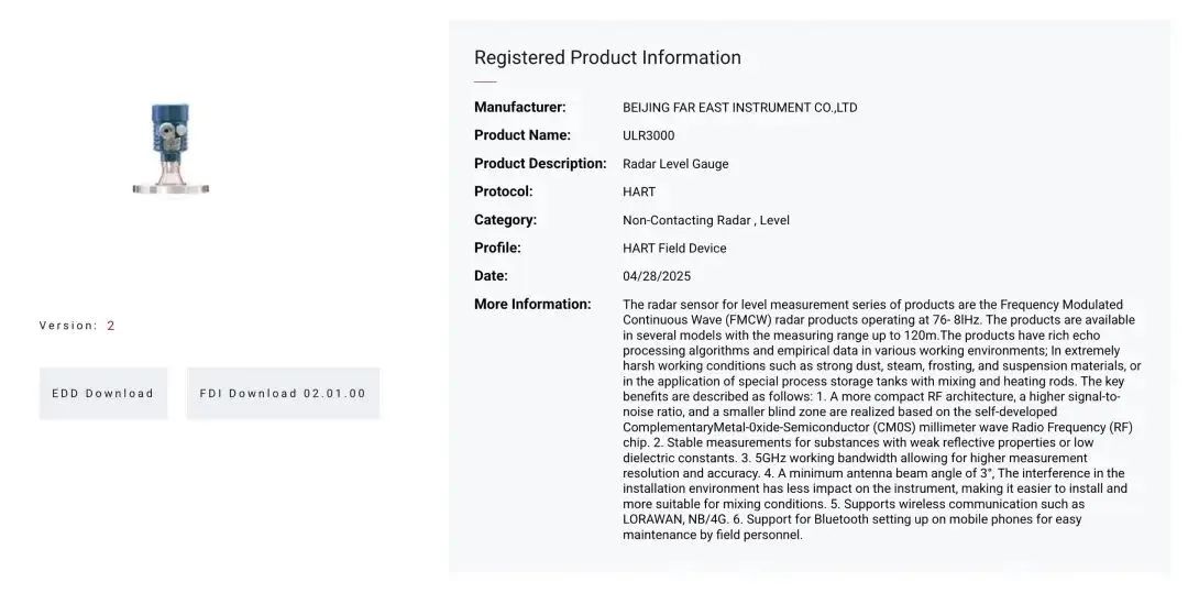 近日,遠東儀表公司自主研發的ULR3000連續調頻雷達物位計正式通過國際權威機構 Field Comm GroupHART® 7通信協議認證(注冊號:L2-06-1000-1219),并嚴格符合 GB/T 29910.1-6-2013IEC 61158國際標準,標志著該產品在技術性能、通信兼容性及標準化水平上達到國際領先水準。