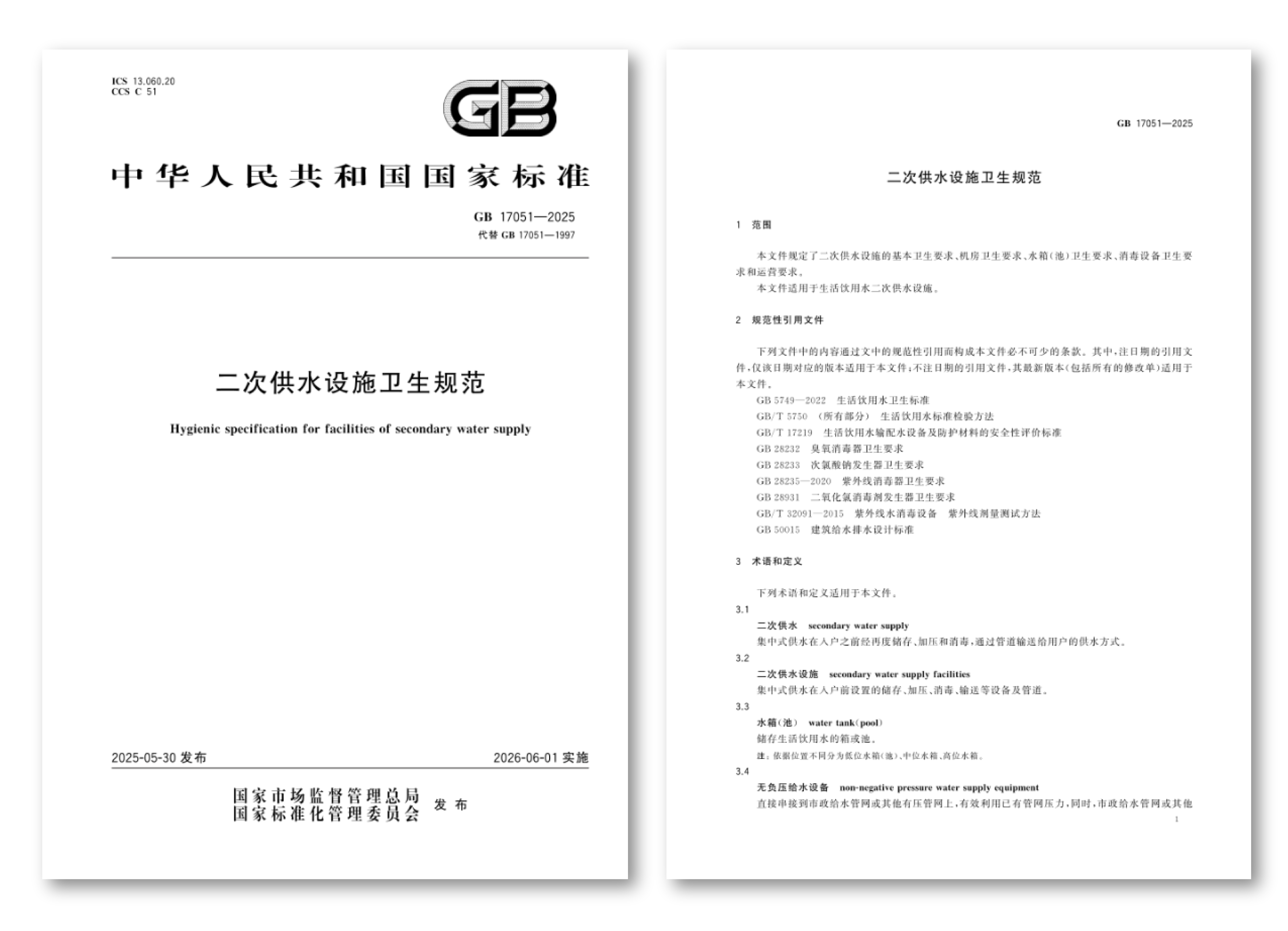 GB 17051-2025二次供水設施衛生規范,2025-05-30 發布,2026-06-01實施。此標準規定了二次供水設施的基本衛生要求、機房衛生要求、水箱()衛生要求、消毒設備衛生要求和運營要求。此標準適用于生活飲用水二次供水設施。