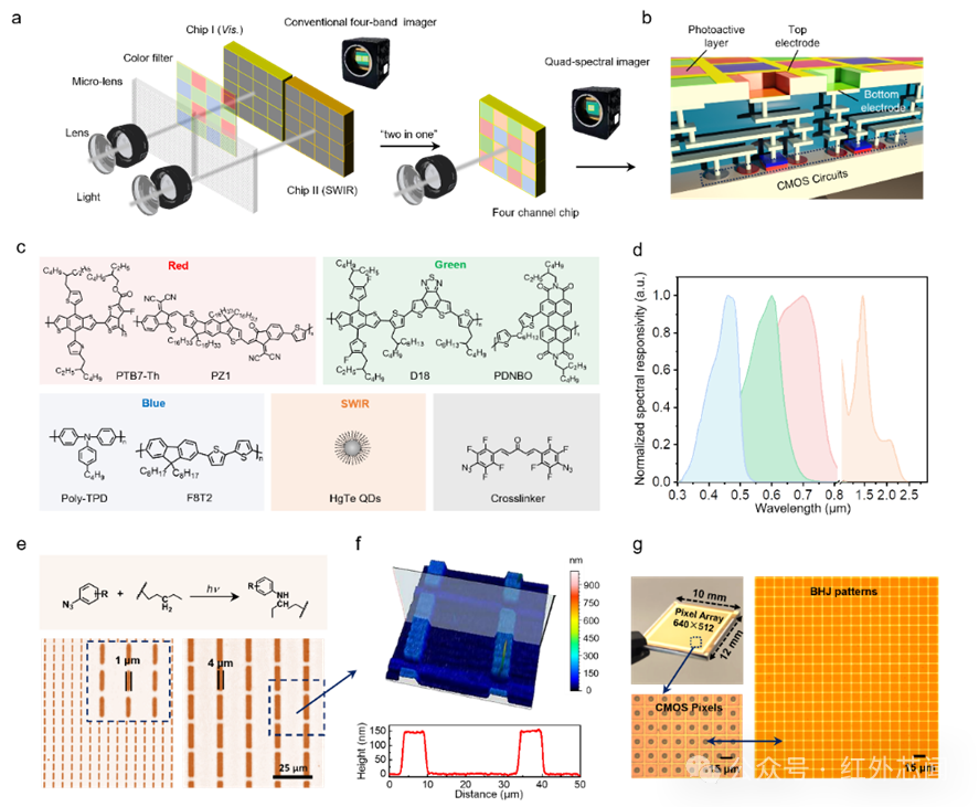 1聚焦多通道圖像傳感器的核心設計與制備基礎,系統呈現集成架構、材料選型、圖案化機理及CMOS兼容特性。對比采用可見光圖像傳感器+短波紅外圖像傳感器的分離架構,這項研究聚焦單一集成芯片設計,將可見光像素與短波紅外像素集成于單芯片,解決了復雜分光光路設計難題,且通過直接光刻圖案化工藝,實現多波段探測像素單片集成,解決了可見光與短波紅外像素CMOS工藝的兼容性難題。利用圖案化技術,本體異質結(BHJ)及膠體量子點像素可以與讀出電路(ROIC)單片集成,具有640×512像素陣列,像素間距為15 μm