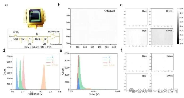 所提出的直接光圖案化方法與標準CMOS制造工藝完全兼容。研究人員將基于聚合物的三色可見光像素與基于碲化汞量子點的短波紅外像素單片集成到同一讀出電路上。這種混合集成策略使得四通道成像器件得以實現,其中可見光和短波紅外像素以2×2陣列排列,每個子陣列的有效分辨率為320×256