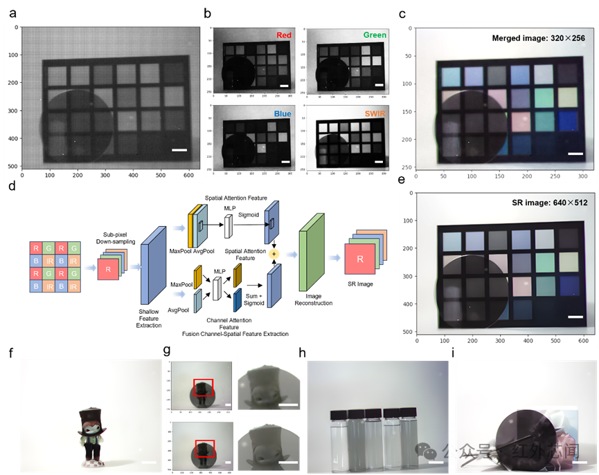 多通道像素架構通過平面空間劃分實現了多通道(RGB-SWIR)探測,但同時也將每個波段通道的物理分辨率降低至320×256像素。為了克服這一分辨率限制,作者提出了一種用于四通道光譜成像芯片的超分辨率重建方法,構建了一個融合“通道-空間”注意力機制的特征增強網絡。為分辨率降低提供了補償策略,為平面集成式多通道圖像傳感器建立了一種高分辨成像新范式,超越光譜通道數量與空間分辨率之間的競爭關系。