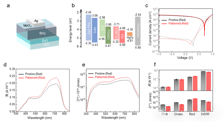能圖2主要展示圖案化后單元像素器件性能表征。非破壞性圖案化方法對于保持高性能光電探測器的光電完整性至關重要。為了評估光電二極管架構中像素圖案化的兼容性,采用有機異質結和碲化汞量子點作為活性層,制備了單元器件,并對圖案化前后的電流曲線、響應光譜、比探測率、響應度等關鍵指標進行了系統表征。