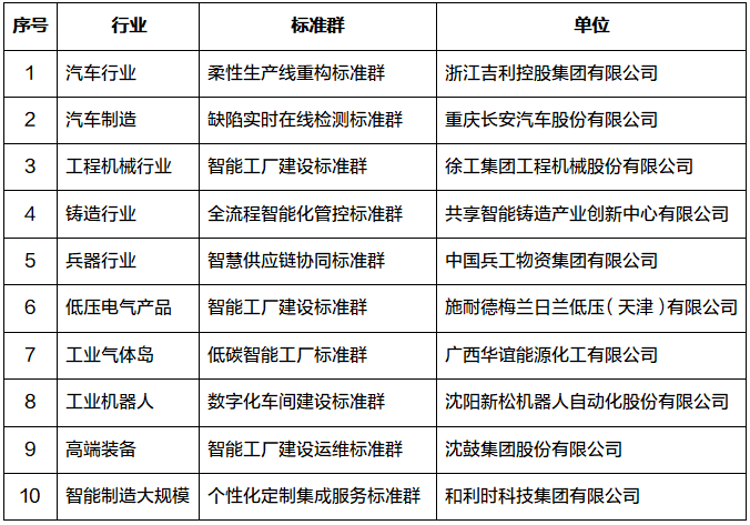 在本次會議上,發布了首批“智能制造標準應用試點”十大標準群成果。具體如下: