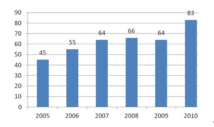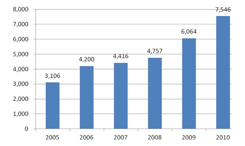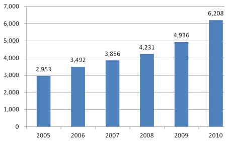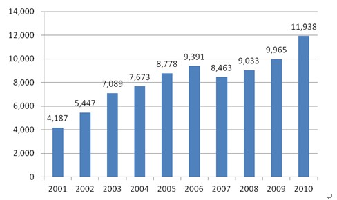 圖11:2005-2010我國家用電冰箱產(chǎn)量(萬臺)