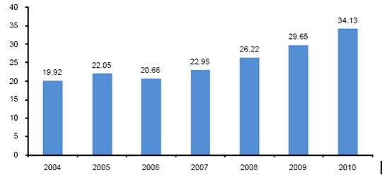 “十一五”期間我國物流基礎設施的不斷建設和完善,物流業取得了快速的發展。2004年我國物流業固定資產投資總額為0.67萬億元,到2010年投資規模已經達到3萬億元,年復合增長率達到28%;2004年我國社會物流總額為40萬億,到2010年已經達到125萬億元,年復合增長21.74%。
