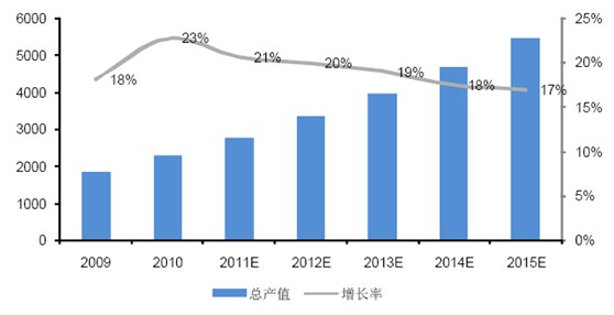 傳感器是安防設備的核心器件,未來傳感器在安防領域的市場規模增速將和安防行業的產值增速同步,預計未來5 年年均增長在20%左右。根據我國安防行業“十二五”發展規劃(審議稿),到“十二五”末期實現產業規模翻一番的總體目標,年均增長率達到20%左右,2015 年總產值達到5000 億元;而在2010 年,我國安防行業總產值達到2,300 億元,年增長率23%。